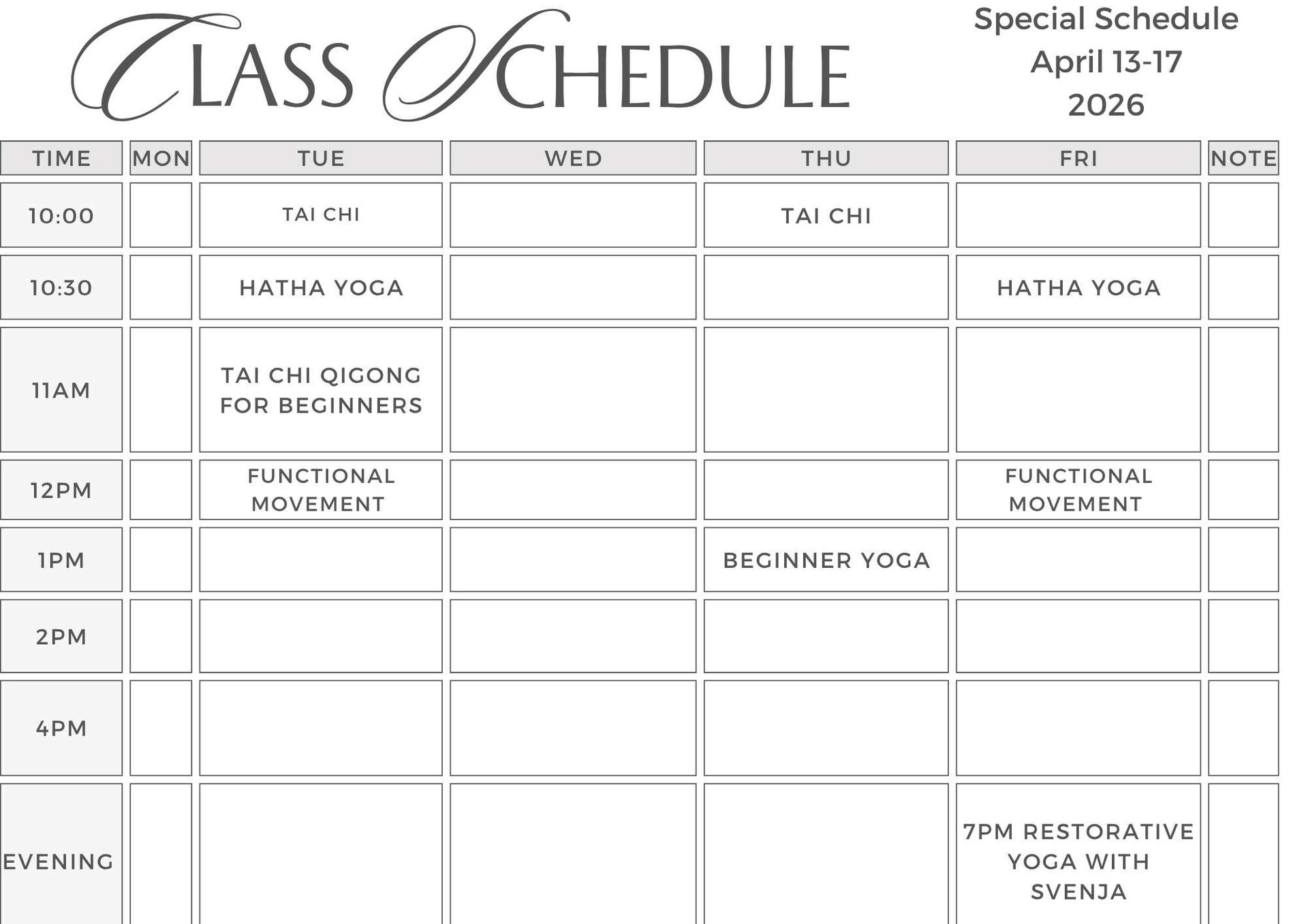 Tuesdays and Fridays at 10:30am Hatha Yoga (**instructor permission required to join these classes)